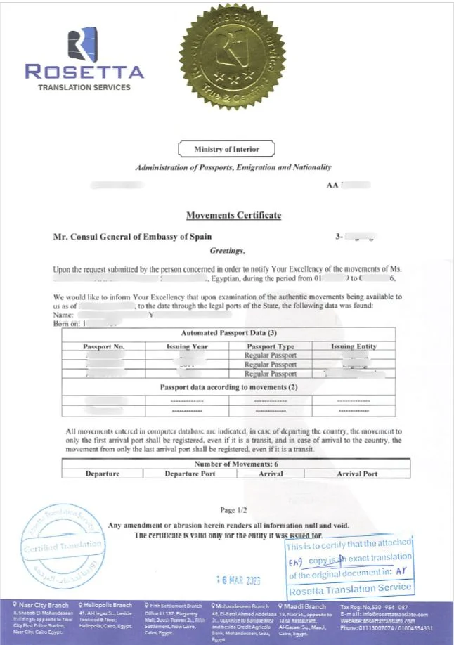 معايير ترجمة شهادة التحركات في شركة روزيتا للترجمة المعتمدة
