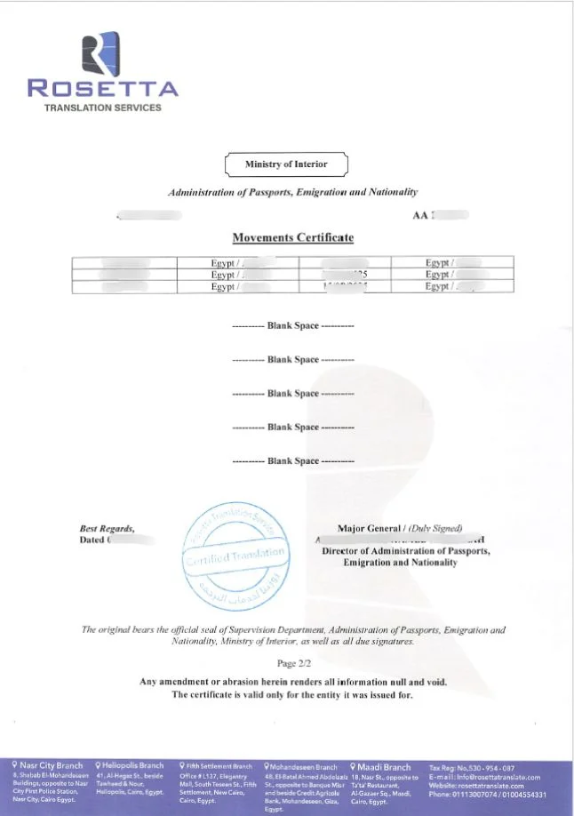 المستندات التي نترجمها في روزيتا بجانب ترجمة شهادة التحركات