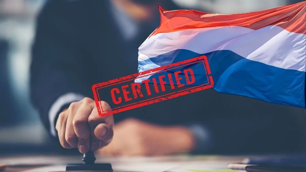- ختم الوثائق بختم مكتب ترجمة معتمد من السفارة الهولندية.